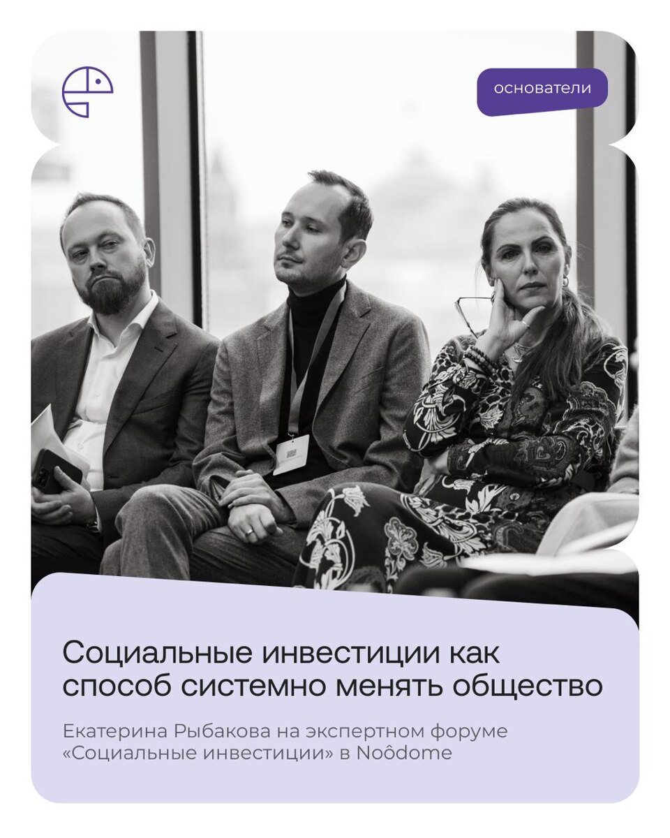 Социальные инвестиции как способ системно менять общество У наших партнёров сообщества Noôdome прошёл экспертный форум «Социальные инвестиции», организованный совместно с Центром социального проектирования «Платформа». Форум собрал представителей экспертного сообщества, бизнеса и государства, чтобы обсудить, как социальные инвестиции могут становиться частью долгосрочного развития — компаний, территорий и общества Экспертный форум был задуман как площадка для открытого диалога и поиска траекторий перехода от социального инвестирования к социальной архитектуре: системному взгляду на среду, отношения и ценности, которые формируют устойчивость В дискуссии «От социального инвестирования — к социальной архитектуре» выступила Екатерина Рыбакова, президент и сооснователь Рыбаков Фонда. Совместно с Марией Морозовой (Фонд Тимченко) и Оксаной Орачёвой (Фонд Потанина) они обсудили, как частные фонды всё чаще переходят к системным практикам — тем, что работают на долгосрочные изменения и формир