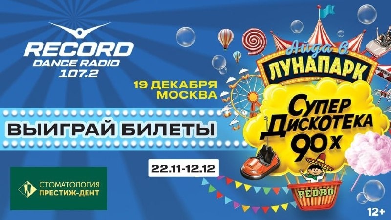 Радио RECORD дарит билеты на легендарную "Супердискотеку 90-х". 19 декабря в Москве музыка и песни, которые унесут зрителей в самый улетный рейв 90-х: Шура, группа «Дюна», Вирус, Алёна Апина, Hi-Fi, Оксана Почепа (Акула), группа «Технология», Русский Размер, 140 ударов в минуту и многие-многие другие + секретный зарубежный гость. Розыгрыш билетов проходит в официальной группе Радио RECORD Рязань В Контакте. По паре пригласительных можно выиграть каждую пятницу: 28 ноября, 5 декабря и 12 декабря. Победители 19 декабря отправятся в незабываемое путешествие в лунопарк ретро-хитов от Радио RECORD в Москву.