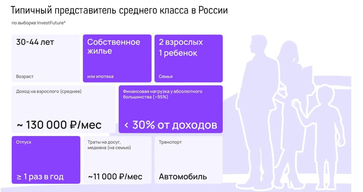В средний класс или вилкой в глаз? Средний класс — "прослойка" между бедными и богатыми, которая, по сути, больше всего и страдает. Иногда создаётся впечатление, что его выделяют только для того, чтобы ликвидировать. Как в старой доброй "красной" традиции: "отнять и поделить". Одно неверное движение и средний класс превращается в бедный, а чтобы перейти в "высшую" лигу, нужно очень сильно постараться. Бедные живут по принципу: "Не жили богато — нечего начинать",а богатые (адекватные): "Счастье любит тишину". В России, да и в мире, если честно, довольно сложно определить этот самый средний класс. Официальное определение сводится к формуле "зарплата выше определённой доли от медианы". Ну хз, слишком расплывчато. Компания Invest Future провела "народный" опрос-исследование и выделила условия, позволяющие людям ощущать себя представителями среднего класса. Основные процентные распределения по критериям смотрите в инфографике. По результатам исследования определили: Средний класс в