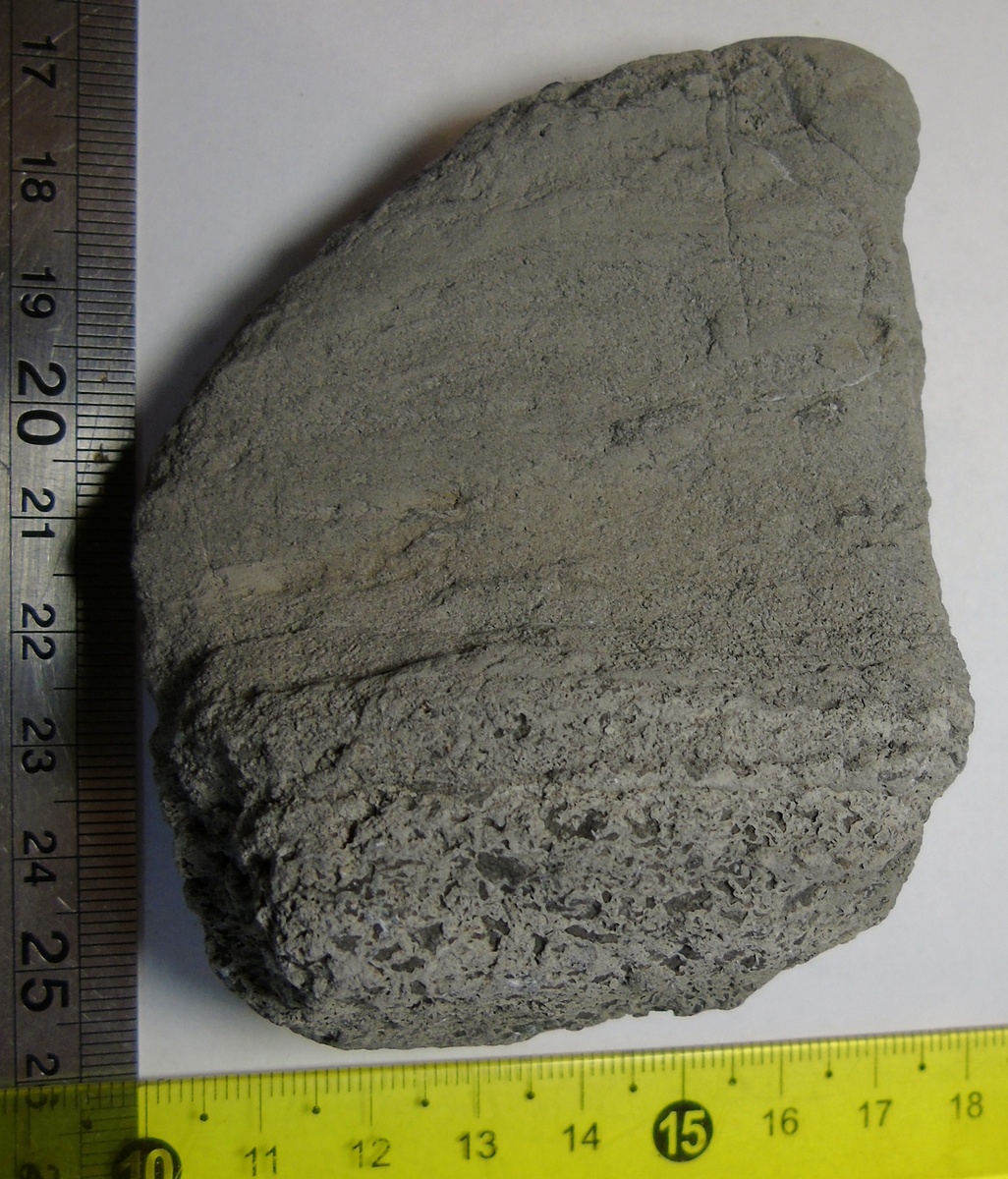 Кроме чёрных углеродсодержащих известняков с ходами илоедов на втором участке работ, на Чипчиконе, встречались весьма редкие образцы светлых известняков с одиночными ходами илоедов. Данный образчик встретился в отвалах глубокой копуши до четырёх метров, выкопанной экскаватором в галечнике для забора воды в баню. Копуша была недалеко от камералки, и я иногда туда прогуливался, чтобы просто посмотреть на воду в копуше. Там была всего пара образчиков светлого известняка с ходами илоедов и с частичками угля. Происхождение частичек угля сложно назвать. Известняки образуются в основном в морских бассейнах. Поэтому один из вариантов происхождения углистых частичек связан с морскими растениями. Но порода сильно запесочена крупными частичками песка, что говорит о прибрежно-лагунном происхождении этого известняка. И я думаю, что, скорее всего эти угольные частички, были когда-то остатками наземных растений и были принесены в прибрежную зону либо реками, либо ветрами с морского берега, разб