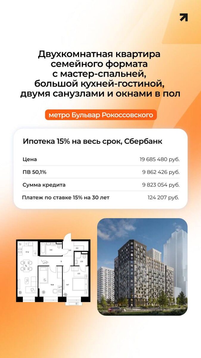 Ипотека по ставке 15% в проекте «Лосиноостровский парк» от девелопера ПИК Ипотека 15% — фиксированная ставка на весь период, возможное рефинансирование в будущем. Идеально для тех, кому важен фиксированный и понятный платёж даже при высоких базовых ставках на рынке. Условия программы: – ПВ от 50% – Ставка от 15% – Срок до 30 лет; сумма до 60 млн ₽ Примеры расчетов квартир в проекте «Лосиноостровский парк» ⚪️ Студия 30.7 м² с увеличенными окнами и местом под гардероб ⚪️ 2ккв. 56.6 м² с мастер-спальней