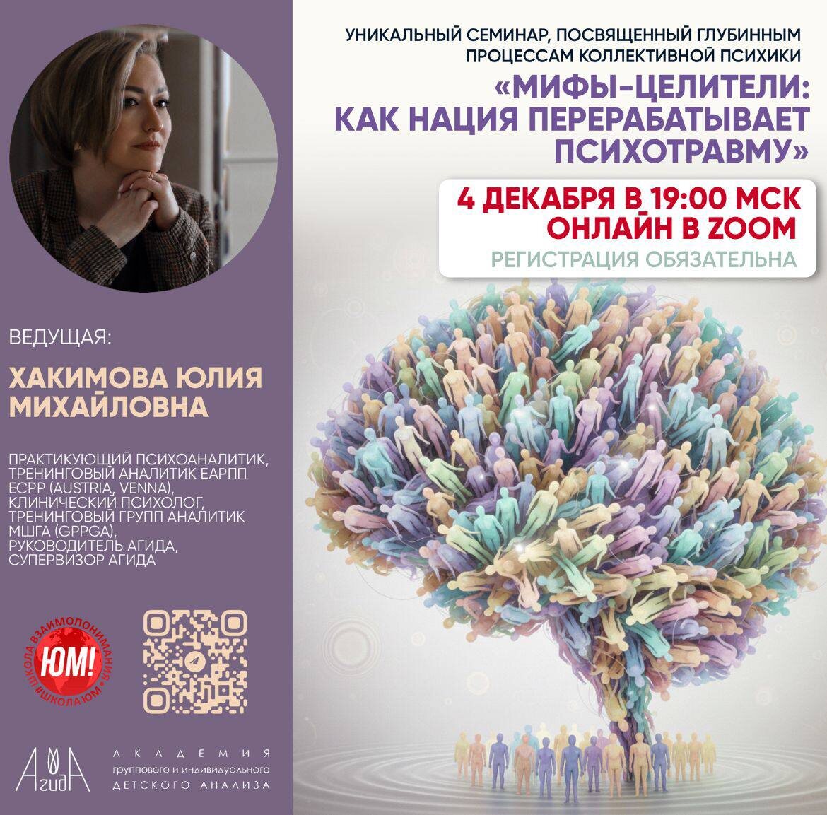 Уважаемые коллеги, друзья!🤝 Приглашаем вас на уникальный семинар, посвященный глубинным процессам коллективной психики. «Мифы-целители: Как нация перерабатывает психотравму» ✨ Ведущий семинара: Хакимова Юлия Михайловна психоаналитик, тренинговый аналитик ЕАРПП (национального отделения ECPP), клинический психолог, тренинговый группаналитик МШГА (GPPGА), руководитель АГИДА ✅ Мы исследуем, как коллективная травма находит свое выражение и, что важнее, — исцеление в пространстве культуры и мифа. ✅В фокусе нашего внимания — феномен русской ментальности, отраженный в двух ключевых архетипических сюжетах. ✅Мифы на протяжении веков служили психологическими «инструментами», помогающими народу осмыслить исторические потрясения, боль утрат и найти в себе силы для жизни. На семинаре мы разберем: 📌 Понятие национальной психотравмы и ее отличие от индивидуальной. 📌 Два фундаментальных мифа-целителя для российского сознания: какой архетип дает утешение и надежду, а какой — силы для преодол