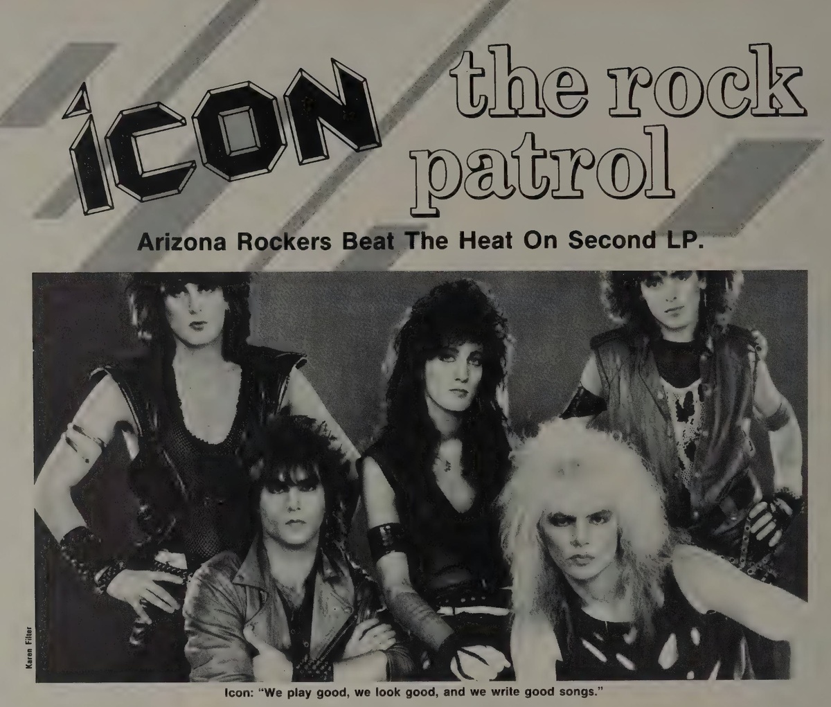 Hit Parader. 1985. Июль Феникс, штат Аризона, – не совсем идеальное место для создания хэви-метал группы. Когда в тени доходит до 100 градусов – а это бывает часто – становится слишком жарко, чтобы хорошо выглядеть в коже. Эта проблема до боли знакома Дэну Векслеру из ICON до боли знает. «Это место – подмышка страны», – сказал он со смехом. «Здесь постоянная паровая баня. Если вы слишком далеко от кондиционера или бассейна, вам лучше на них забить. Вы когда-нибудь пробовали играть на электрогитаре в бассейне? Это может быть очень захватывающим опытом». Несмотря на экологические проблемы, с которыми столкнулись Векслер и его товарищи по группе: Пэт Диксон, Стивен Клиффорд, Джон Акилино и Трейси Уоллах, им удалось сделать ICON одной из самых интересных молодых хард-рок-групп, которые сейчас хрюкают и стонут на метал-рынке. Со своим вторым альбомом Night Of The Crime, который ещё больше утвердил их как группу, за которой стоит следить на метал-сцене, ICON считают, что этот год станет важн