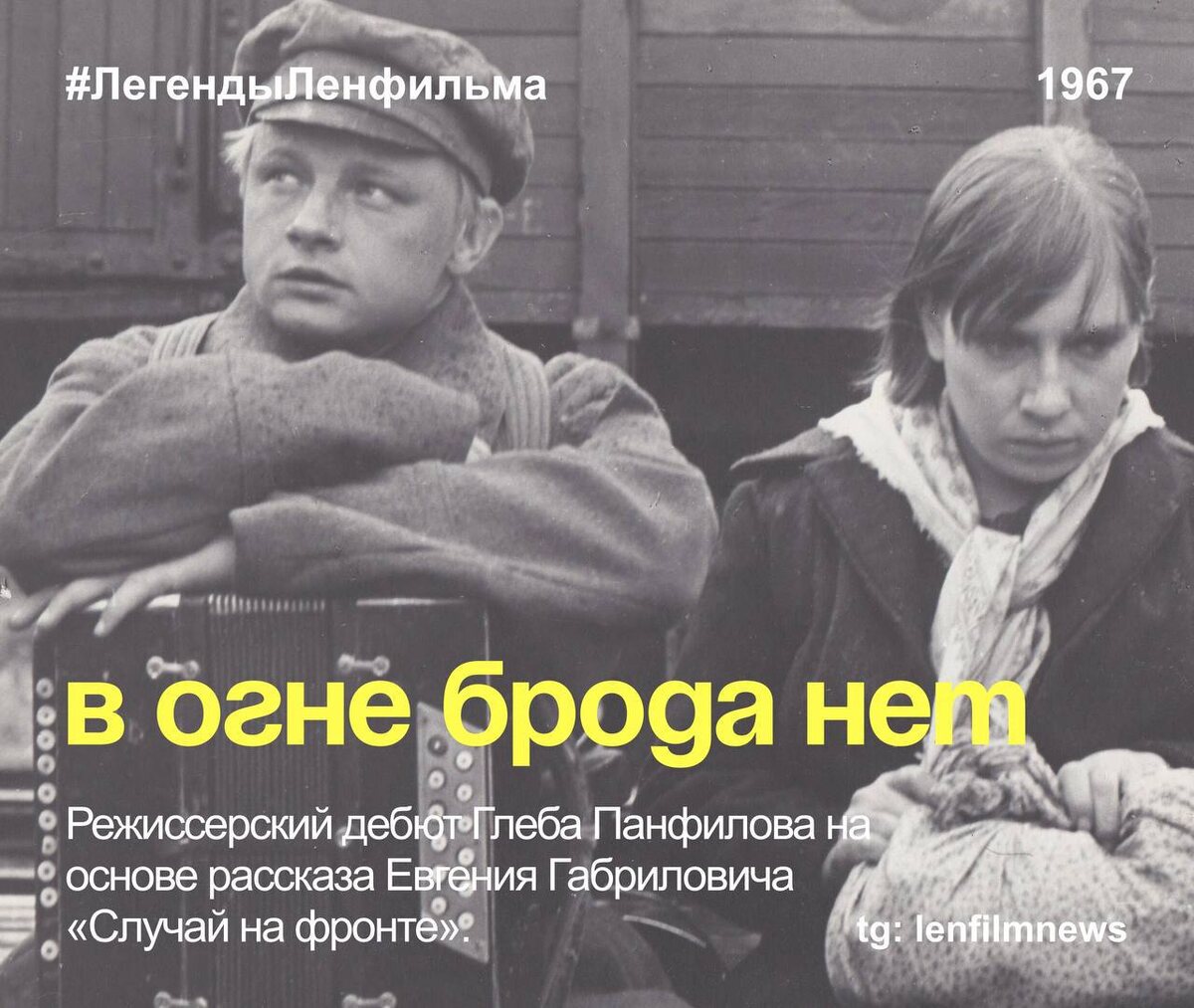 В огне брода нет (1967) 🎬 В санитарном поезде, вывозящем раненых с фронтов гражданской войны, работает санитаркой Таня Теткина. Эта юная, застенчивая, некрасивая, полуграмотная девушка искренне верит во всемирную революцию. Она еще не осознает всего происходящего, но желание поведать обо всем в рисунках обнаруживает у нее дар самобытного художника. 📎Это фильм о гражданской войне, но в нем нет ни выстрелов, ни кавалерийских и штыковых атак, ни сверкающих шашек и захлебывающихся пулеметов. «В старом журнале «Красная новь» за 1939-й год я наткнулся на небольшой рассказ Евгения Габриловича «Случай на фронте». Какая девочка, какой характер – неожиданный, парадоксальный! Меня всегда волновали, интересовали такие люди, как Таня Теткина». Глеб Панфилов #ЛегендыЛенфильма