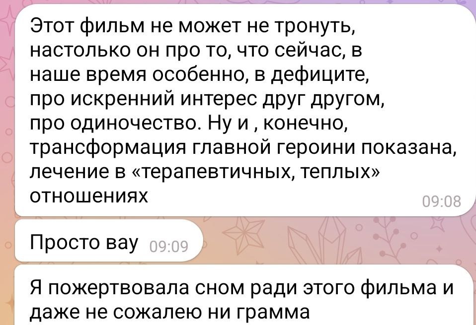 В ответ на пост На выходных с коллегами обсуждали фильм "Боб Тревино поставил лайк". Каждого переполняли эмоции, каждому откликались какие-то определенные эпизоды. Так интересно было наблюдать, как по-разному мы видим, трактуем одну и ту же ситуацию. Тем удивительнее в процессе обсуждения глубоко раскрывались ситуации, которые сперва казались тебя никак не затрагающими. А потом: "ооо, а я и не думала в таком ключе! Вау...а у меня же в жизни так происходит!" В общем, наша 2х часовая встреча оказалась не только душевной, но и немного терапевтичной. Если решитесь посмотреть, берите не только ручку и листочек, чтобы записывать и осмысливать, но и платочки. Пару раз точно захочется поплакать. Прикрепила полученную в личку обратную связь после просмотра фильма ❤️ Спасибо, что делитесь. И рада, что вам понравилось