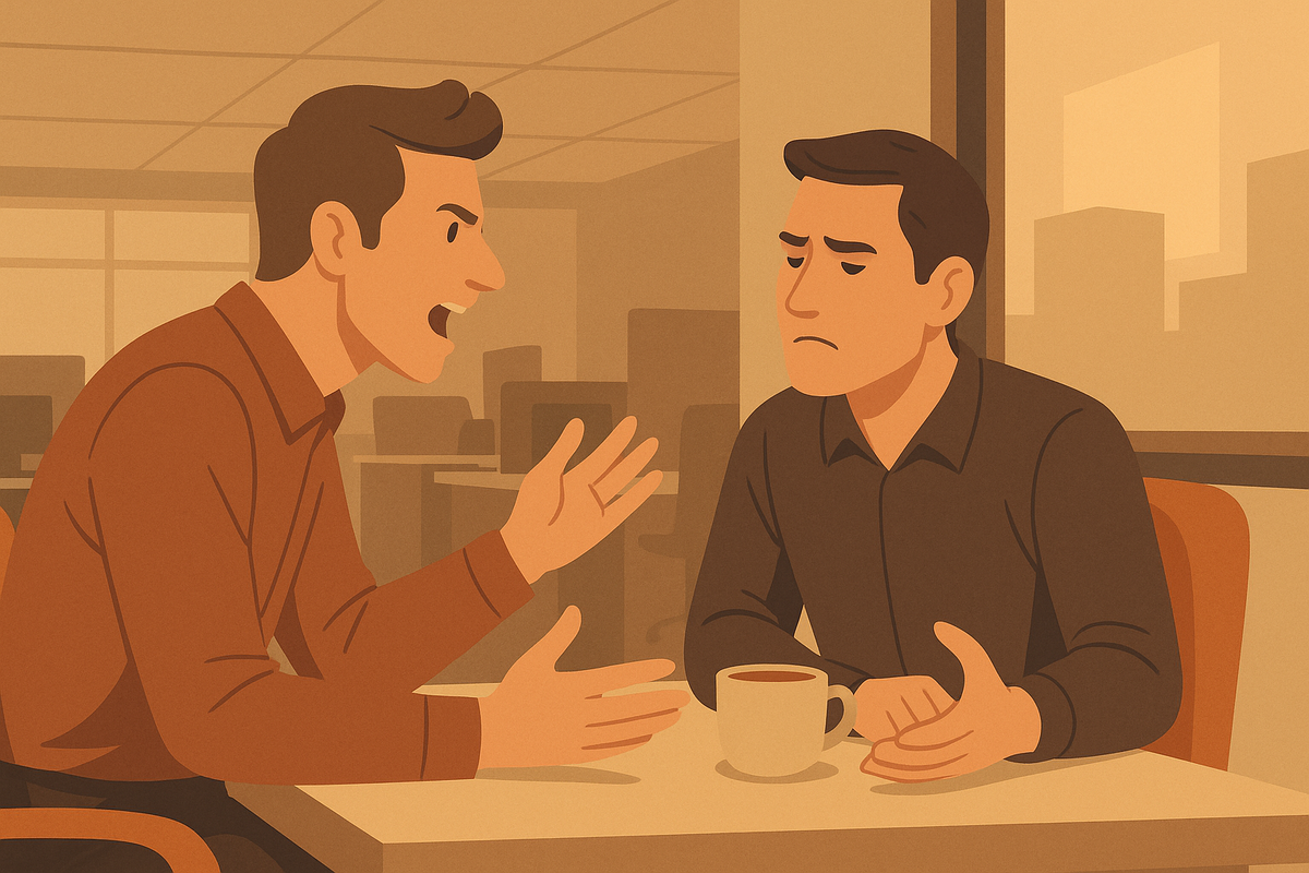 Вспоминается история из кафе — два коллеги обсуждали новую задачу, и изначально разговор шёл спокойно. Но потом один из них начал говорить всё быстрее, словно боялся, что его мысль кто-то заберёт или испортит. Он объяснял, размахивал рукой, вскакивал на каждую фразу. Второй сидел напротив, держался за чашку, делал вдох, открывал рот, но снова слышал очередной поток. Спустя пару минут он уже не слушал — он просто ждал, когда человек закончит. Или выдохнется.