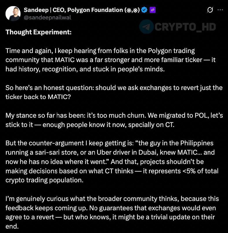 ☹️ #POL Сооснователь Polygon рассматривает возможность возвращения тикера MATIC… Раз за разом слышу от людей из сообщества Polygon, что MATIC – гораздо более сильный и узнаваемые тикер, у него есть история. Честный вопрос: следует ли нам попросить биржи поменять тикер обратно на MATIC? Моя позиция до сих пор была такой – слишком много суеты. Мы уже перешли на POL, давайте не дергаться – тикер уже достаточно знают, особенно в крипто-твиттере. Но мне постоянно приводят встречный довод: «Вот парень на Филиппинах, у которого маленький магазинчик, или водитель Uber в Дубае – они знали MATIC…а сейчас просто не понимают, куда он пропал». И что проекты вообще не должны принимать решения, ориентируясь на крипто-твиттер – соц. сеть покрывает меньше 5% всей аудитории трейдеров. Мне правда интересно, что думает широкое сообщество, потому что такие отзывы всплывают снова и снова. Нет никаких гарантий, что биржи вообще согласятся возвращать старый тикер – но кто знает, может, это вопрос пары к