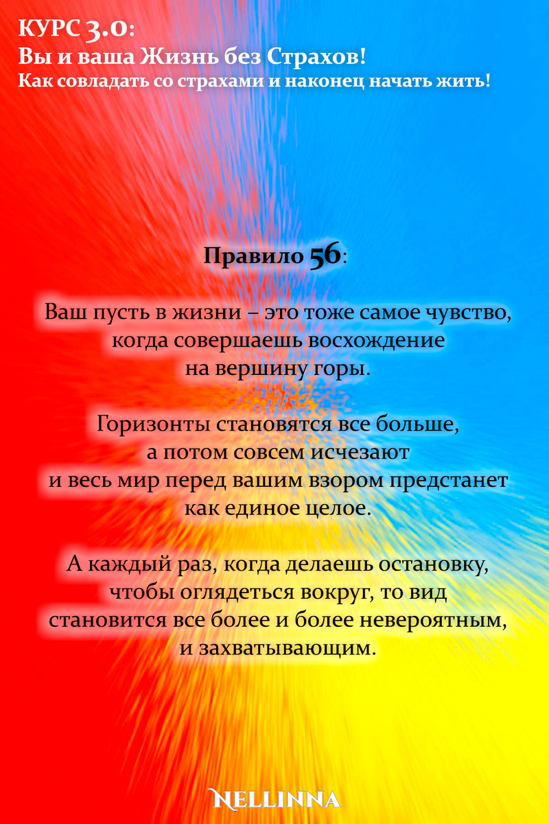 Продолжение - Принцип 56: Пока вы будете помнить, что жизнь – это непрерывный процесс обучения, вас не будет тревожить мысль, что вы чего-то в свое время недополучили. В жизни у вас есть два опыта, первый происходит из вашего высшего «Я», который вы принимаете как чистую радость, и второй, приходит в жизни с возрастом, который вы принимаете как борьбу. Изменить дорогу, которая лежит под вашими ногами, можно лишь тогда, когда измените путь, пролегающий в вашей голове. Сначала расставьте - все по своим местам в своей голове, а следом на свои места встанет все вокруг вас. Чтобы не пропустить следующую публикацию – Подписывайтесь! И делитесь полезной и бесплатной информацией! #курс #тренинг #обучение #практикум