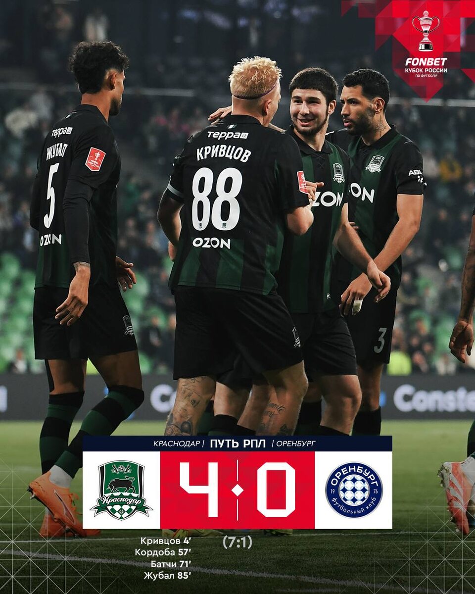 👏 «Краснодар» разгромил «Оренбург» и вышел в 1/2 финала Пути РПЛ Кубка России