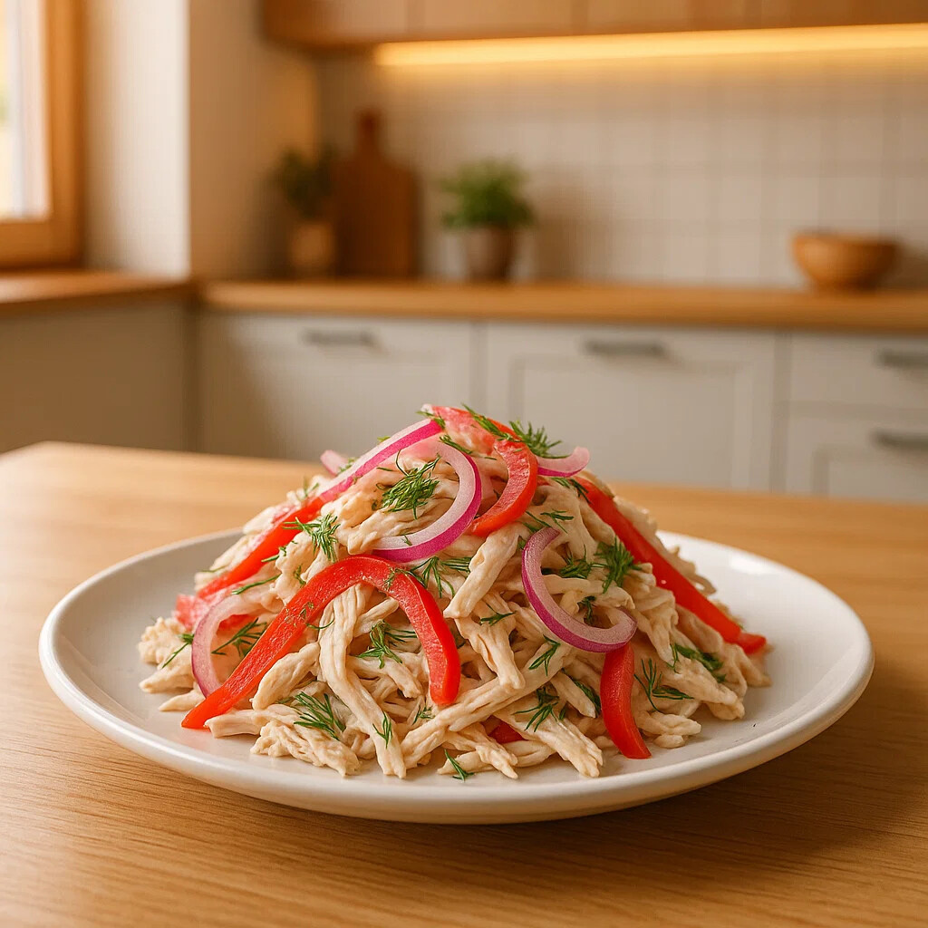 Яркий, свежий и очень сочный салат, который украсит любой стол! Красный сладкий перец, нежная курица и маринованный лук создают гармоничное сочетание вкусов, а ароматный укроп добавляет лёгкую свежесть. 🛒 Ингредиенты: Куриное филе (отварное) — 500 г Красный сладкий перец — 500 г Красный лук — 2 шт. Майонез — 4 ст. л. Укроп — 4 веточки Яблочный уксус — 2 ст. л. Сахар — 1 ч. л. Соль — 1 ч. л. Вода — 4 ст. л. ✨ Заправка: Майонез 👨🍳 Приготовление: Замаринуйте красный лук: нарежьте полукольцами, залейте смесью из уксуса, сахара, соли и воды. Перемешайте и оставьте на 30 минут, периодически помешивая. Красный перец нарежьте соломкой и выложите в салатник. Отварное куриное филе разделите на волокна и добавьте к перцу. Укроп мелко нарежьте. Лук отожмите от маринада и добавьте к остальным ингредиентам. Заправьте салат майонезом, перемешайте и при необходимости слегка подсолите. Салат получается лёгким, ароматным и по-настоящему праздничным! 😋