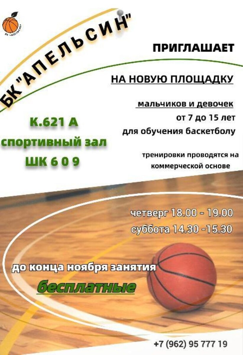 Реклама АНО БК «АПЕЛЬСИН» ИНН:7735201563 erid:2VtzqxjZkX2 Мечтаешь научиться играть в баскетбол? Делаешь первые шаги или уже имеешь опыт и хочешь прокачать свои навыки под руководством тренера уровня ведущих спортивных школ Москвы? Вас ждут: г. Зеленоград, корпус 621А, спортивный зал школы №609 Расписание тренировок: Четверг — с 18:00 до 19:00 Суббота — с 14:30 до 15:30 До конца ноября все тренировки — бесплатно! Далее — 600? за одно занятие. Запись и подробности: +7-962-957-77-19 — Людмила Телеграм: https://t.me/Apelsin_bc