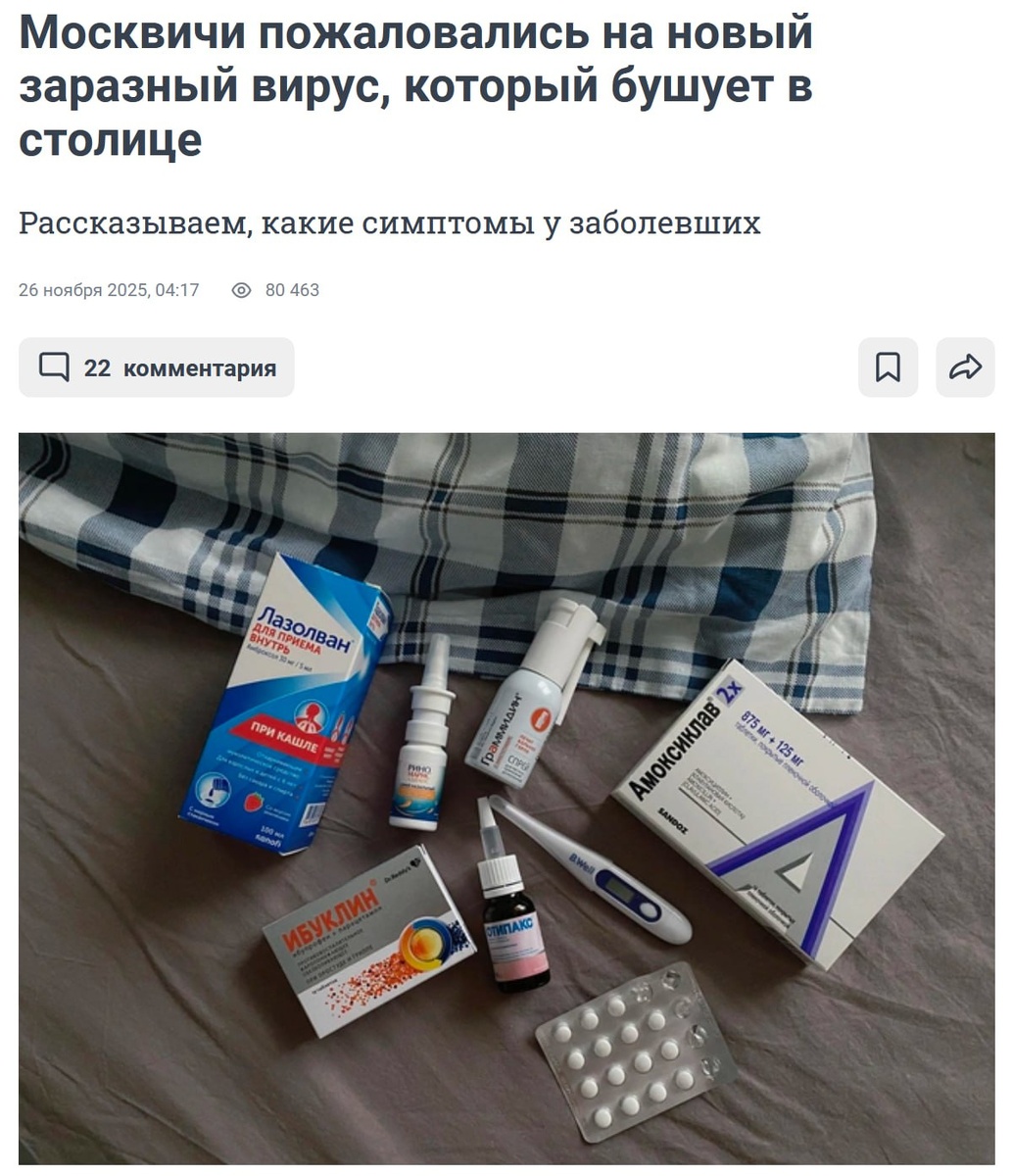 В Москве резко выросла заболеваемость гриппом и ОРВИ. За неделю зарегистрировано почти 6400 случаев — вдвое больше, чем ранее. Среди выявленных штаммов преобладает вирус гриппа А, передающийся воздушно-капельным путём. Больные жалуются на сильную ушную боль, ломоту, температуру, кашель и сонливость. Роспотребнадзор рекомендует оставаться дома при симптомах или носить маску.