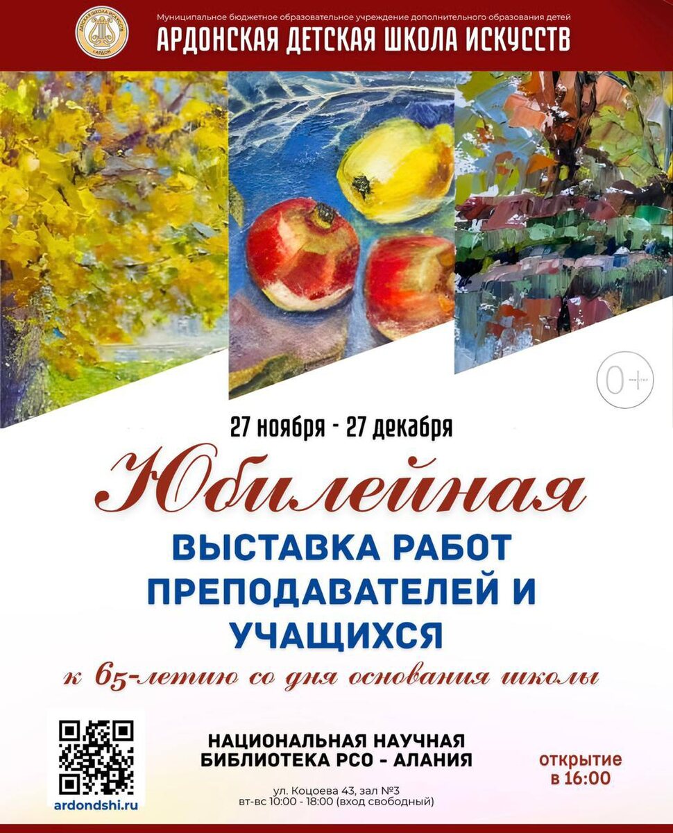 27 ноября в 16:00 состоится открытие выставки работ учащихся и преподавателей отделения изобразительного искусства Ардонской детской школы искусств, посвящённой 65-летнему юбилею школы. На выставке будут представлены около 200 произведений живописи, графики, декоративно-прикладного искусства и скульптуры, созданных за последние пять лет. Экспозиция будет открыта до 27 декабря. Посетить её можно со вторника по воскресенье с 9:00 до 19:00 по адресу: Владикавказ, ул. Коцоева, 43, Национальная научная библиотека.