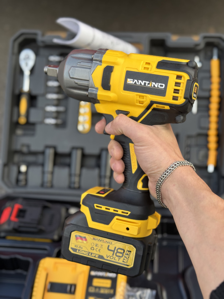 Спасибо что посетили мою страницу🫂 Большинство моих товарищей с драйва уже давно наблюдают за тем, как я пытаюсь найти себе гайковёрт, естественно что б само собой был не дорогим, но при этом ещё был и качественным😁 После знакомства с пилой бренда SANTINO я твёрдо решил, что берём его, Гайковерт бесщеточный, ударный, аккумуляторный, 850 N.m, SANTINO И так, начнем с комплектации 👇 🟡 Аккумуляторная гайковёрт — 1шт. 🟡 Ударопрочный кейс — 1 шт. 🟡Аккумулятор 21В и емкостью 10,0 Ач — 2 шт. 🟡Зарядное устройство — 1 шт. 🟡Инструкция на русском языке 1-шт 🟡Ударные головки -3шт 🟡Переходник с 1/2 на 3/4 — 1шт 🟡Трещетка 3/4 — 1шт 🟡Набор головок 🟡Набор бит 🟡Набор сверл 🟡Гибкий удлинитель Основные характеристики гайковерта👇 🟡Мощность — 850 Н.м 🟡Тип двигателя — Бесщеточный электродвигатель 🟡Регулировка оборотов и количество ударов — 3шт Ну и самые основные плюшки 👇 🟡 3 года гарантии 🟡Ооочень богатая комлектация 🟡 Корпус из вольфрамовой с