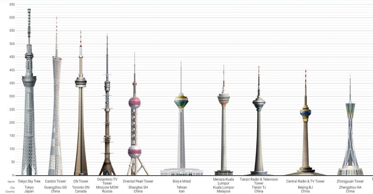 ТОП-10 самых высоких в мире телебашен Телебашни являются любимыми туристическими достопримечательностями. Знаменитая Эйфелева башня в XIX в., понятное дело, не задумывалась как телевизионная, но именно благодаря телевидению позднее «выросла» на 30 м. При этом парижское «чудо света» даже не входит в десятку самых высоких в мире телебашен. А вот кто входит: 1. Tokyo Skytree. Местоположение - Токио, Япония. Высота - 634 м. Год завершения - 2012. 2. Canton Tower - Гуанчжоу, Китай, 600 м., 2010 г. 3. CN Tower - Торонто, Канада, 553,3 м., 1976 г. 4. Останкино - Москва, Россия, 540,1 м., 1967 г. 5. Oriental Pearl Tower - Шанхай, Китай, 468 м., 1994 г. 6. Milad Tower - Тегеран, Иран, 435 м., 2007 г. 7. KL Tower - Куала-Лумпур, Малайзия, 421 м., 1995 г. 8. Tianjin Radio and Television Tower - Тянььзцинь, Китай, 415,2 м., 1991 г. 9. Central Radio and TV Tower - Пекин, Китай, 405 м., 1992 г. 10. Zhongyuan Tower - Чжэнчжоу, Китай, 388 м., 2011 г.
