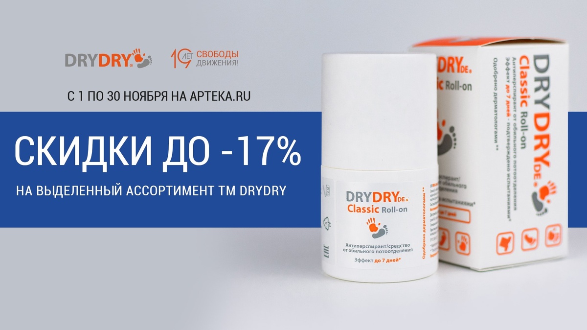 Друзья! Напоминаем, что до 30 ноября в интернет-аптеке apteka.ru скидка до 17% на выделенный ассортимент ТМ DRYDRY Отличная возможность приобрести качественные средства от пота и запаха по замечательной цене.
