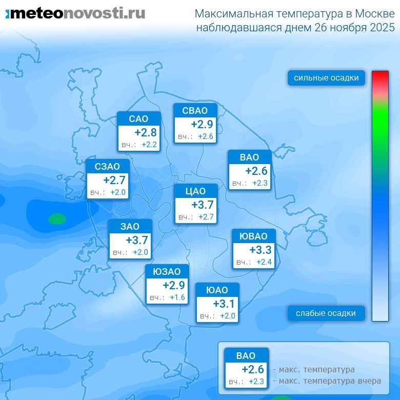 #за12часов #день Прошедший день 26 ноября был на 0.5°C теплее вчерашнего. Максимальная температура днём в Москве оказалась на 3°C выше нормы, что немного теплее, чем обычно. Самая высокая температура +3.7°C была зафиксирована в 14 часов в центре города, а холоднее всего было на юго-западе: +1.5°C. Разница по максимальной температуре в разных частях столицы составила за день 2.2°C. Максимальные порывы ветра днём достигали 3 м/с. Атмосферное давление за день повысилось с 750 до 751 мм.рт.ст. Повсеместно прошли небольшие осадки. Больше всего осадков выпало в центре города – 1.8 мм. Самый теплый день в Москве 26 ноября был в 1969 году, когда максимальная температура составила +9.4°C, а холодный в 1954 году: -12.9°C. Перейти на сайт Прогноз погоды на 14 дней