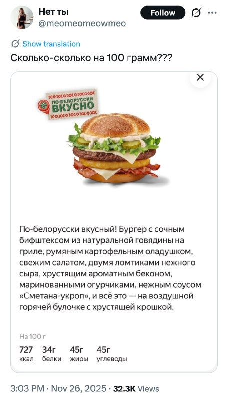 ⚡️ Внимание, работяги! Вы мгновенно РАСКАБАНЕЕТЕ с Минского бургера с драником. Одна порция этого монстра — это 8️⃣0️⃣0️⃣ калорий, то есть почти половина нормы взрослого мужика. Берем эту штуку исключительно с диетической колой, чтобы сохранить хотя бы видимость здорового образа жизни. Подробнее: https://hard-tm.su/threads/130290/ 🕹HARD-TM — Подписаться