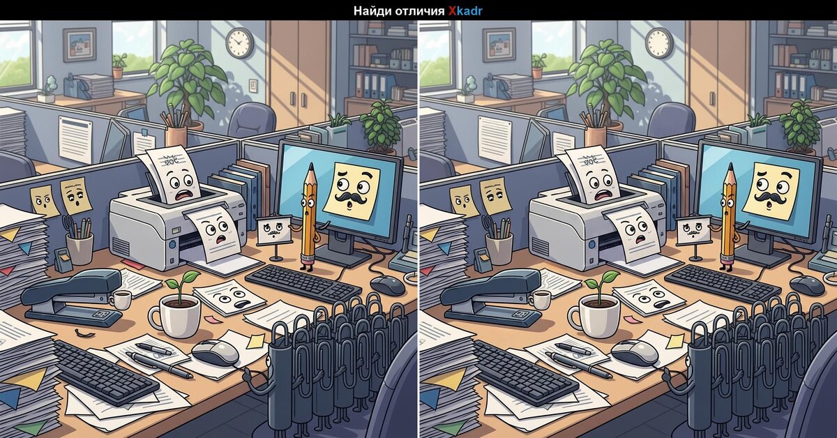 Сегодня у нас новая яркая сцена из ожившего офиса: документы паникуют, карандаш что-то доказывает монитору, а скрепки устроили парад. Но… не всё здесь так просто! В этой картинке спрятаны отличия, и только самые внимательные смогут их найти.
