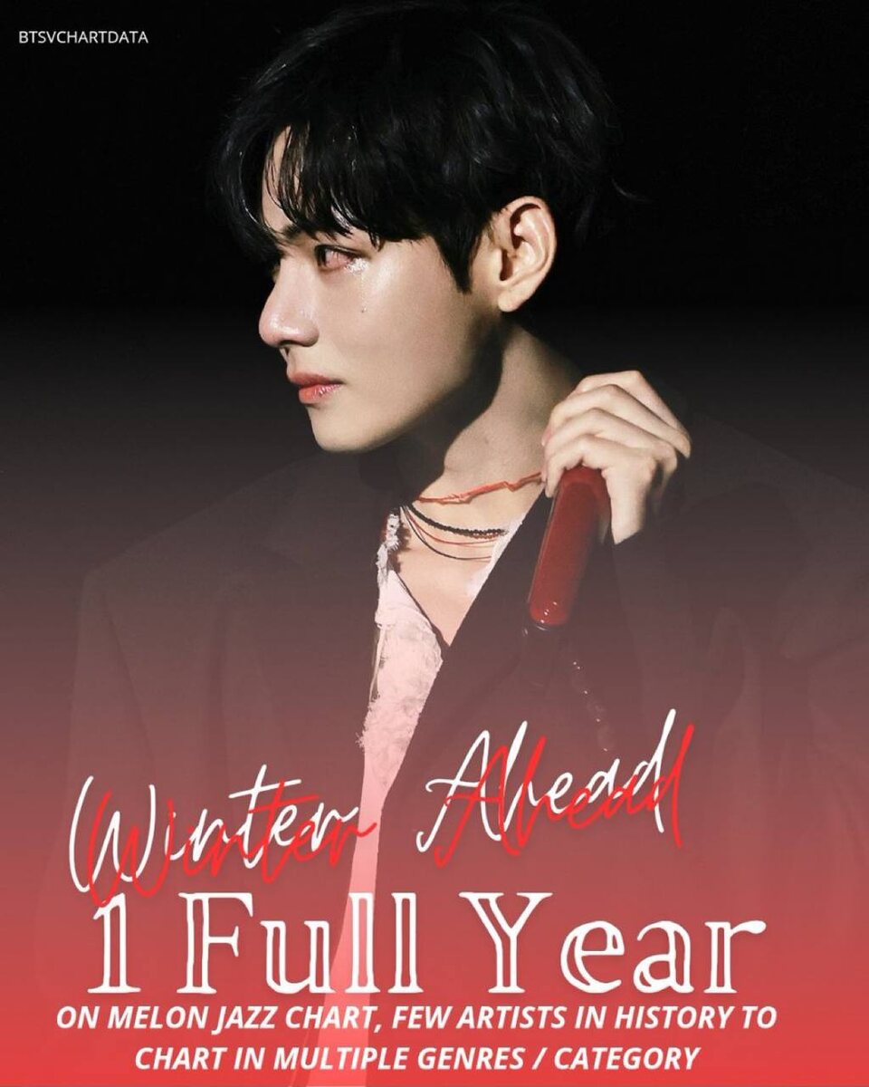 🍒 "Winter Ahead" продержалась целый год в еженедельном джазовом чарте Melon. Ви - один из немногих артистов, добившихся этого с тремя песнями в разных жанрах: "Christmas Tree" в качестве саундтрека, "Wherever u r" - overseas R&B/Soul и "Winter Ahead" - джаз. cr.btsvchartdata #V @kumihobts