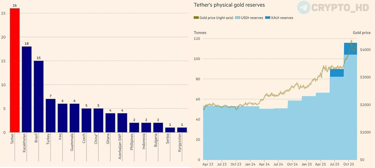 💎 Объем золота у Tether сравнялся с резервами ЦБ Южной Кореи, Венгрии и Греции (FT