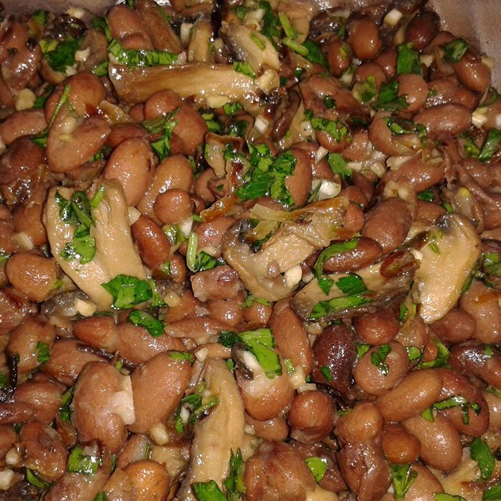 ✔ Фасоль сухая (красная/пёстрая) - 200 г; ✔ Грибы: свежие - 300 г, или сухие – 30-40 г; ✔ Лук - 1 шт.; ✔ Масло растительное – 2,5 ст. л. (для жарки); ✔ Грецкие орехи (очищенные) - 30 г (горсть); ✔ Зелень (петрушка/кинза) - 20 г; ✔ Соль, перец - по вкусу. Фасоль тщательно промойте. Залейте холодной водой в большой кастрюле (1:3). Оставьте на 8-12 часов. Если грибы сушеные: залейте их отдельно холодной водой. Варка: Фасоль варите в той же воде, в которой она замачивалась, на медленном огне 1-1.5 часа до мягкости. Не солите! Соль добавляется в конце, иначе фасоль будет жесткой. Подливайте кипяток, если вода выкипает. Грибы (сушеные): Процедите воду через марлю, промойте грибы. Варите 20-30 минут до мягкости. Если у вас грибы свежие, то их нужно нарезать и обжарить до румянца с луком. То же самое нужно будет сделать со сварившимися сушёными грибами. С готовой фасоли слить остаток воды, выложить фасоль в миску, добавить грибы с луком, зелень, молотые орехи и перец. Остаётся добавить зелен