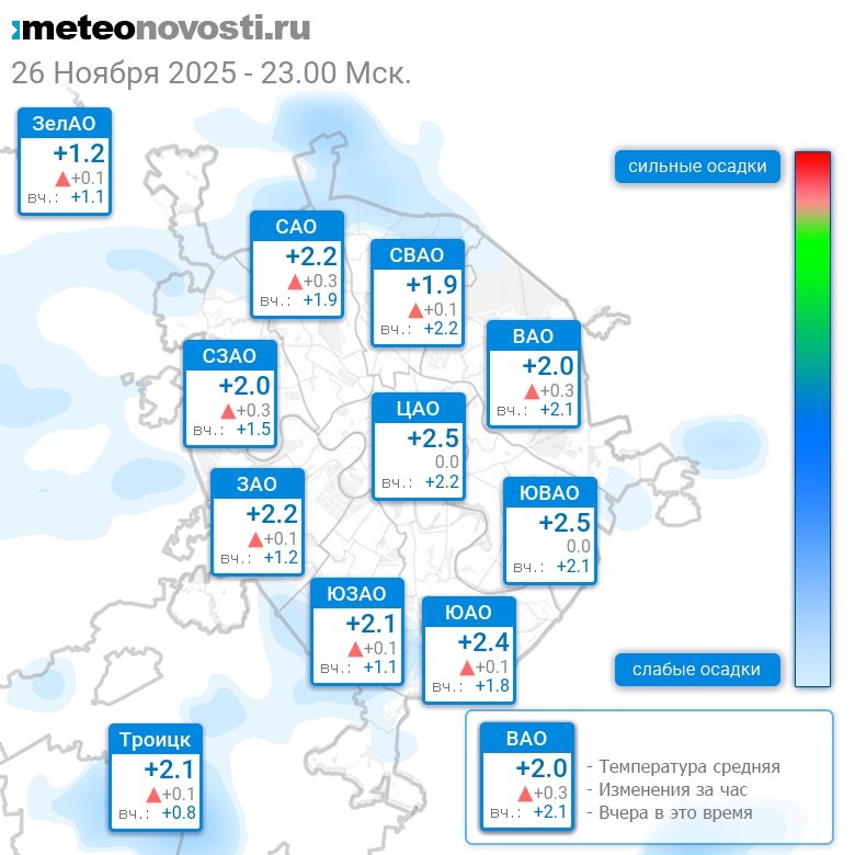 В 23:00 в Москве было от +0.7°C до +2.9°C, средняя температура +2.2°C #погода #Москва #осень #температура #26ноября #среда Перейти на сайт Прогноз погоды на 14 дней