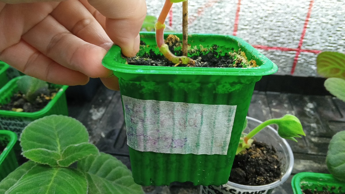 26.11.25 Находка на цветочном стеллаже стало главным событием сегодняшнего дня. Недавно я плакалась что этот сорт Глоксинии у меня утерян, а она ко мне вернулась. Малышка росла тихонечко, поднатужилась и показала свои лепестёнки. Вчера мне некогда было поливать цветы, я вся издергалась, и работать надо и делами заниматься совсем некогда и цветы опять заброшенные. Срочно и обморочно начала поливать цветули с утреца. И ....и... я её нашла... - А чего это там мелькнуло? А кто это у нас тут? Ооооййй... а ну покажись... ути-пути-бозе-мой... моя малышечка... моя мурмысечка.... На полке с укорененными листьями Глоксиний есть несколько "летних подростков". Надпись на горшочках от воды смыло, супер-тонкий маркет размывается водой. И у меня растут несколько неопознаваемых. Теперь моя задача: сохранить малышку, вырастить и размножить. Постараюсь. Распустилась у меня Синнингия кремовая. Мне понравился этот цветулёк. Клубневый пушистик с забавными колокольцами. Теперь буду ждать когда вырастут и
