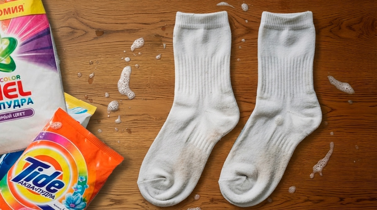 Каждое утро я надеваю детям белые носки. Чистые, свежие, без пятнышка - готовые к школе. Но уже через несколько часов они возвращаются домой с серыми подошвами и загадочными пятнами, как будто ходили не по школьному двору, а через целый лес. Белоснежные носки превращаются в серые, с коричневой подошвой, пятна от земли, грязи, чего-то таинственного, что дети приносят прямо со школы. Сначала я пыталась игнорировать это, думала: «Ну ничего, постираю и снова белые». Но обычная стирка не справляется. Пятна будто въедаются в ткань, особенно на подошве. Каждый раз, когда достаю носки из корзины, чувствую усталость и бессилие. Я перепробовала всё, что приходило в голову: 1. Порошки для стирки Я бросала носки в стиральную машину с порошком Persil, Tide, Ariel или Losk, выбирала режим «Белое бельё». Машина шумела, вода набиралась, пена образовывалась вокруг носков. После стирки я доставала их и разочарованно смотрела: белые участки слегка светлее, но подошвы всё равно серые, а старые пятна на пя