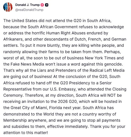 Trump disinvites South Africa from 2026 G20 in Miami over anti-white 'abuses' US will stop ‘all payments and subsidies’ to the country South Africa ‘refuses to acknowledge horrific Human Right Abuses endured by Afrikaners,' according to Trump