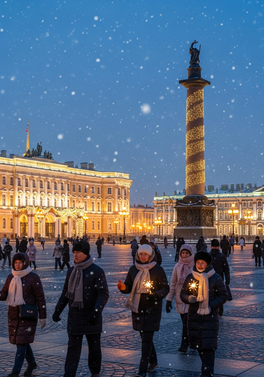 - Где лучше встретить Новый год в Санкт-Петербурге? Дворцовая площадь — главное место встречи Нового года с грандиозным салютом и световым шоу. Альтернатива — Стрелка Васильевского острова с панорамным видом на фейерверки или уютные рестораны с видом на город.