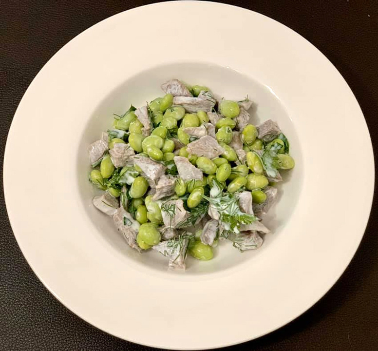 На 2-3 порции: ✔ Язык говяжий (отварной) - 250 г; ✔ Бобы соевые зелёные (эдамаме, очищенные) - 150 г; ✔ Творог козий (5-9%) - 100 г (можно взять любой другой); ✔ Зелень (петрушка, укроп, кинза) - 30 г; ✔ Соль, перец - по вкусу. Язык отварить в подсоленной воде. Время варки зависит от языка. Очистить от кожи. На салат я взяла 250 г. Бобы разморозить, забросить в кипящую воду на 2-3 минуты. Слить, остудить, очистить. Зелень нарезать. Все выложить в чашу, добавить творожок, посолить, перемешать, КБЖУ на 100 г - 165/14,4/10,5/3,7. + 5 фото Рецепт на странице Автор рецепта – Екатерина П. Расчёт КБЖУ сделан с помощью Telegram-чат-бота https://t.me/vesipitaniebot © Почтенный возраст Online и Рецепты для диабетиков
