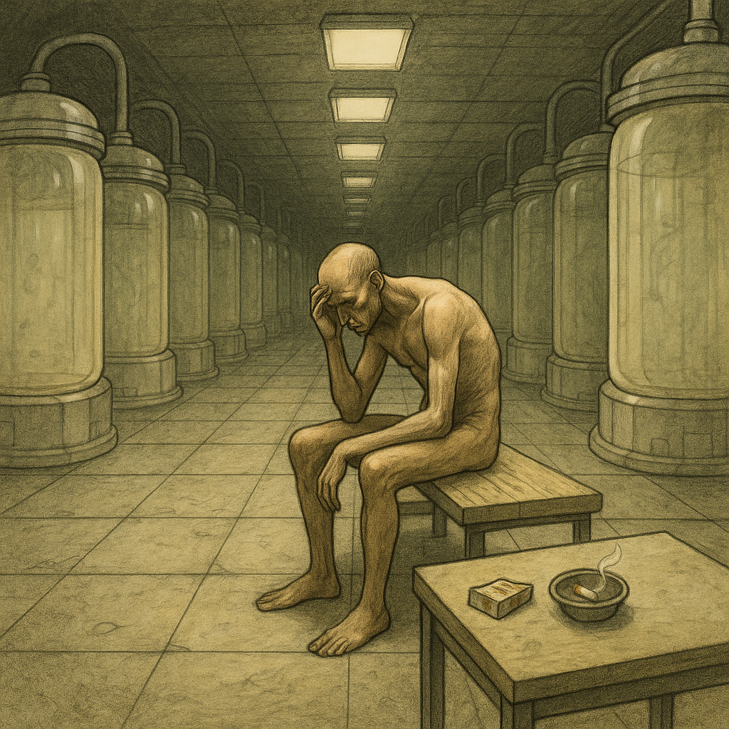 Яркая вспышка перешла в мягкий жёлтый свет. Включились насосы, гулко откачивая физраствор из огромной колбы. Неизвестно сколько прошло времени, как вдруг шум стал сильно громче, что-то в тонкой пластиковой стенке щёлкнуло, и наступила тишина. Сработали запорные механизмы, дверь, шипя изношенной пневматикой медленно открылась. На холодный металлический пол, сгорбившись и качаясь, вышел голый человек. Под потолком зажглись лампы, осветив огромный зал по которому в несколько рядов выстроились такие же стеклянные чаны.