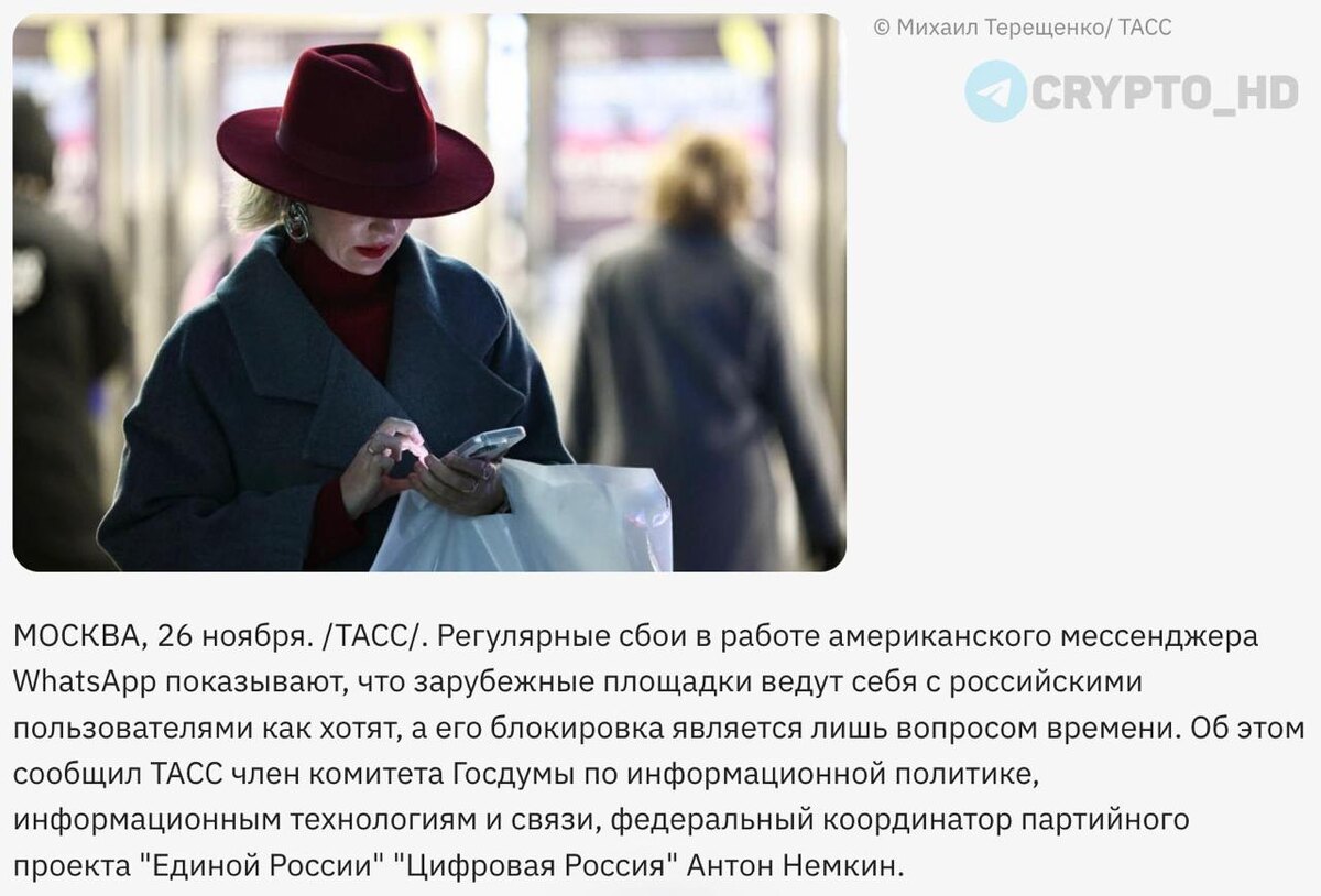 🚫🇷🇺 Блокировка WhatsApp в России – вопрос времени (депутат Госдумы А. Немкин) Ранее: - ограничения на регистрацию - сбои в работе - останется только MAX - запрет звонков в WhatsApp и Telegram - создатель «убийцы Telegram» - блокировка Telegram - Telegram - всё? - Великий китайский файрвол - отключение рунета Cryptо Headlines