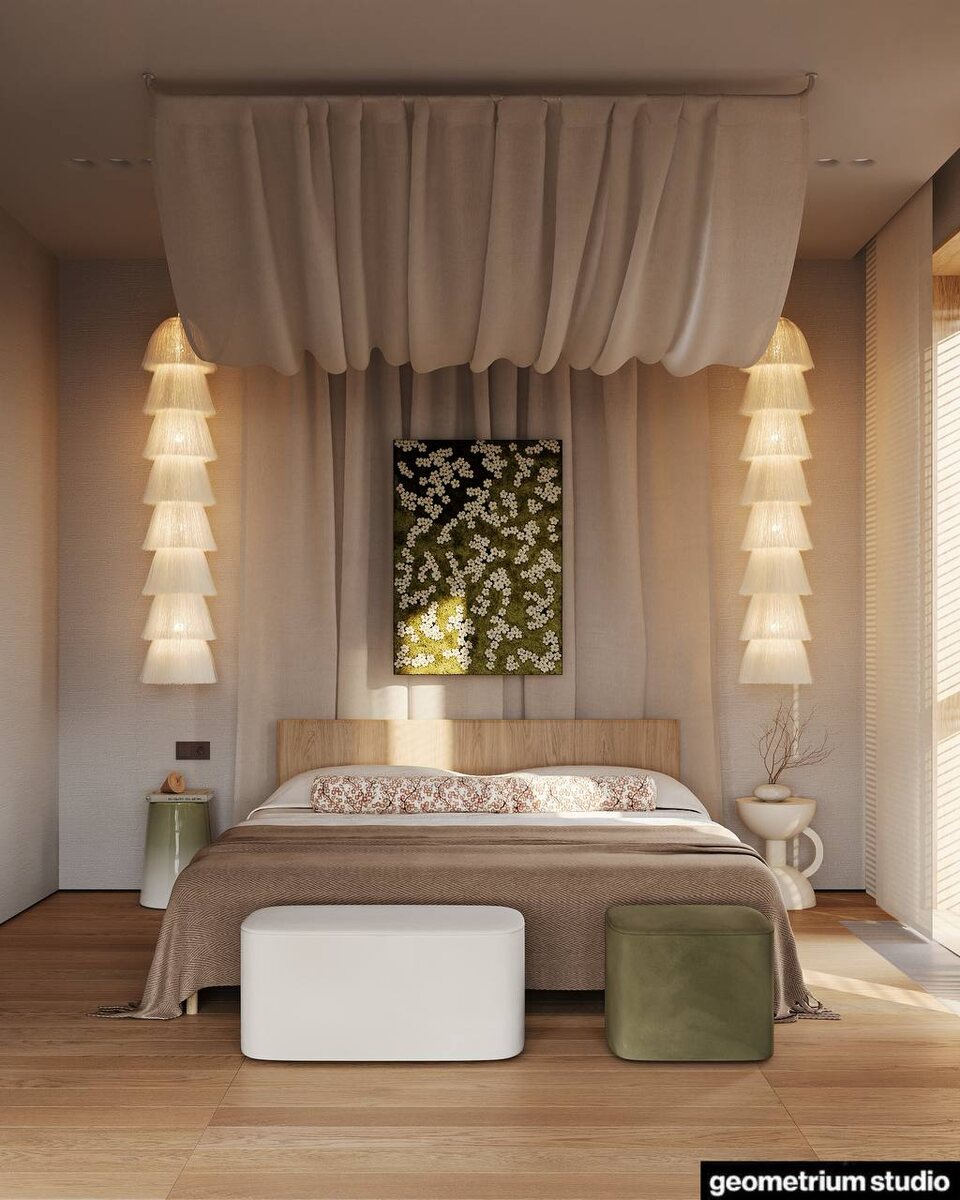 Для нашей заказчицы спальня выступает зоной хрупкости. Это убежище, в котором можно позволить себе быть уязвимой и насладиться чаем из фарфоровой кружки. Спальная комната организована как уединённое место для отдыха и сна. В помещении нет телевизора. Помимо кровати, из мебели только прикроватные столики и пара шкафов для одежды. Над кроватью размещён светлый балдахин. За изголовьем кровати на кронштейнах для балдахина крепятся лески с панно из ткани. Прикроватное освещение также из ткани. Тема нестандартных подвесных светильников раскрывается и в этой комнате. Паркет продолжается из комнаты на лоджию, что создаёт ощущение объединённого помещения. На лоджии располагается зона релакса: кресло с кофейным столиком. Оставляйте «❤️», если понравился стиль и общая концепция проекта!