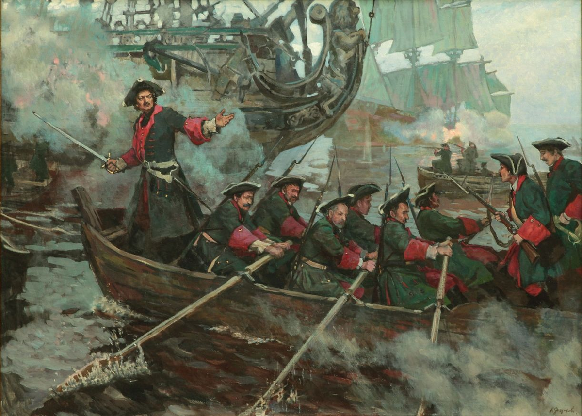 Но именно в этой асимметричной войне проявился гений русского солдата. Не имея линейных кораблей, русские пехотинцы на простых гребных судах — карбасах и лодках — творили чудеса. В 1702 году они дерзко атаковали шведские корабли на Ладожском и Чудском озерах. А 7 мая 1703 года произошло событие, ставшее символическим днем рождения Балтийского флота.