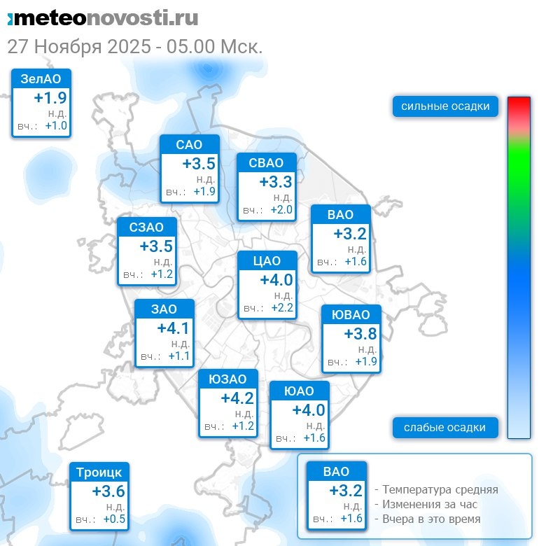 В 5:00 в Москве было от +1.8°C до +5°C, средняя температура +3.6°C #погода #Москва #осень #температура #27ноября #четверг
