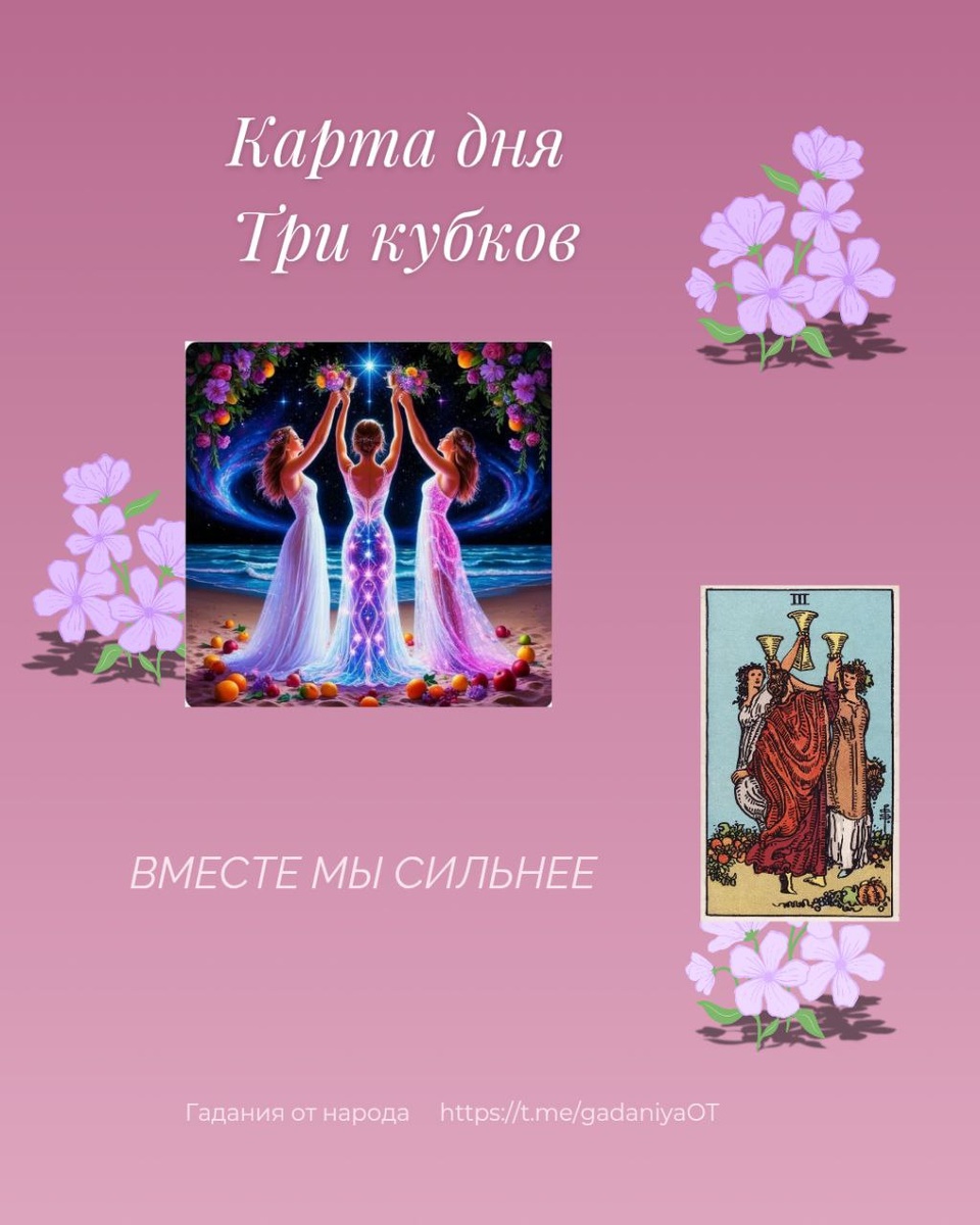 Карта дня — 3 Кубков Сегодня день, который стоит прожить чуть легче. 3 Кубков — про тёплое общение, поддержку, хорошие новости и маленькие радости, которые поднимают настроение. Побудьте рядом с теми, кто вас понимает. Позвоните близкому человеку, вспомните о ком-то добром, уделите время тем, с кем спокойно и легко. Это карта про чувство плеча рядом. И про простое человеческое «хорошо, что ты есть». Пусть сегодня будет чуть больше тепла, чем обычно.