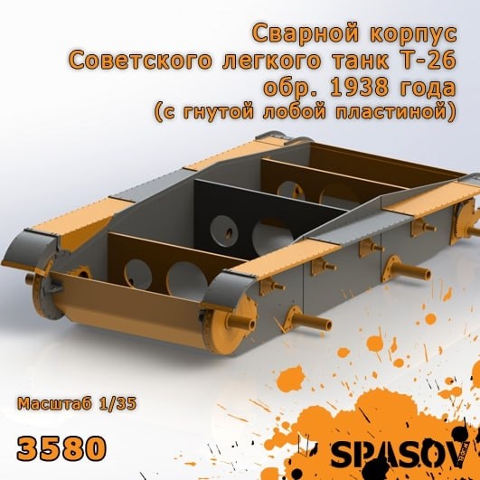 SpAsov выпустил сварной корпус Советского легкого танка Т-26 обр. 1938 года в 1/35 масштабе. Данный набор выпускаем не просто так, а ввиду скорого выхода наших очередных наборов новинок! Думаю, что основные модификации Советского легкого танка мы выпустим в полном объеме! Сейчас в нашей копилке есть машины: 3556 Советский легкий танк Т-26 обр. 1931 года (Пулеметный); 3561 Советский легкий танк Т-26 обр. 1932 года (Гочкис-ПС); 3562 Советский легкий танк Т-26 обр. 1932 года (Б-3). На очереди машины (начнем от большего к меньшему году): Советский легкий танк Т-26 обр. 1939 года; Советский легкий танк Т-26 обр. 1938 года; Советский легкий танк Т-26 обр. 1936-1937 годов; Советский легкий танк Т-26 обр. 1935 года; Советский легкий танк Т-26 обр. 1934 года; Советский легкий танк Т-26 обр. 1933 года. Сам набор отличается от предыдущих: гнутой лобовой пластиной, дополнительными кронштейнами на задней пластине, и конечно же опущенной выхлопной трубой...