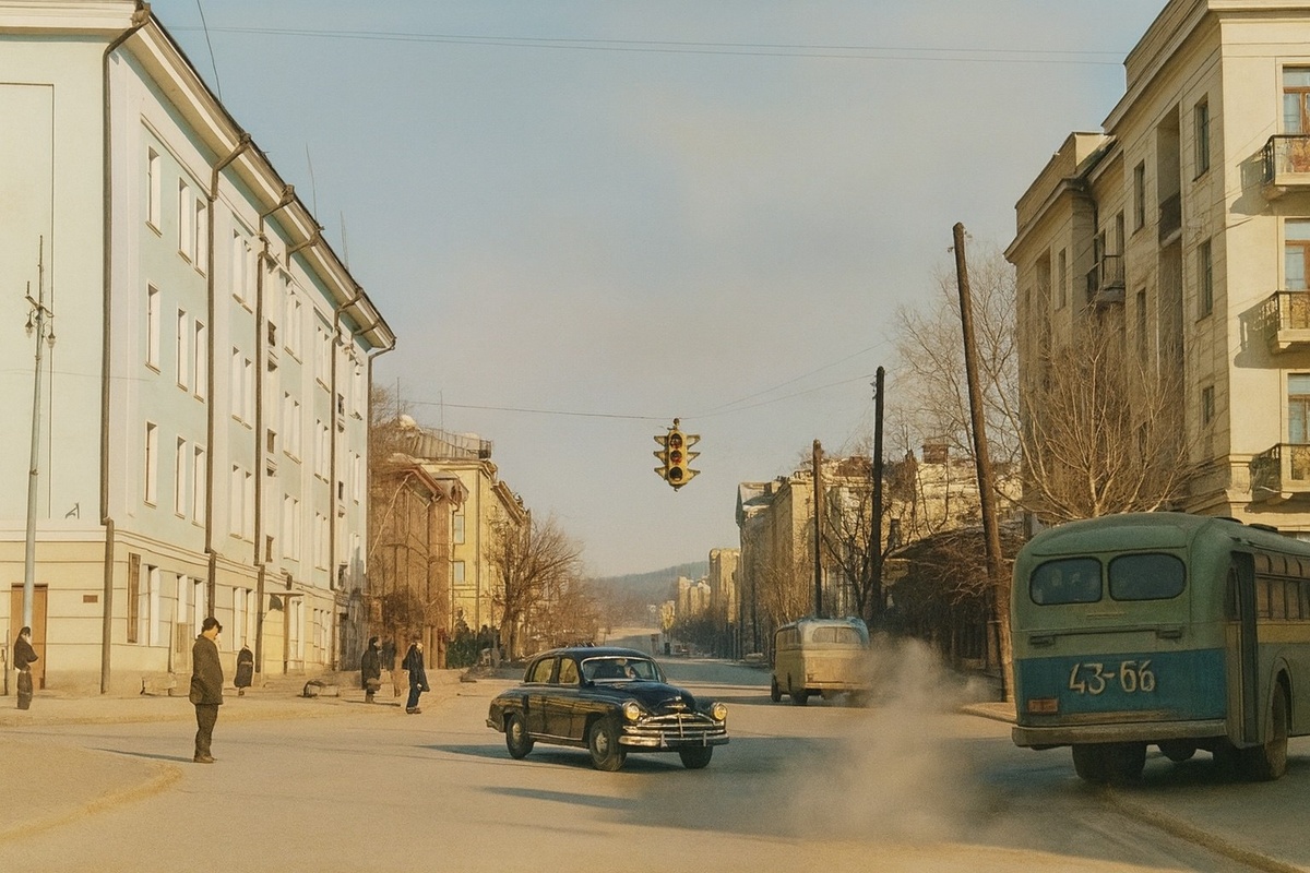 📍 Перекрёсток Калинина (Амурская) — Ленинградская (Корейская) Вид со стороны стадиона «Труд», 1960-е годы. Фото: Г. И. Поломошнов. Восстановлено нейросетью. В кадре — настоящая автомобильная классика эпохи: ГАЗ-М20 «Победа» — легенда послевоенного автопрома (1946–1958). ЗИС-155 — автобус, который разворачивался на улицу Калинина (1949–1957). ГАЗ-51 — рабочая «лошадка» тех лет, на фото везёт дрова (выпуск с 1946 по 1975). На перекрёстке — один из первых светофоров Читы, только начинавшей привыкать к регулируемому движению. Куда пойти в Чите?
