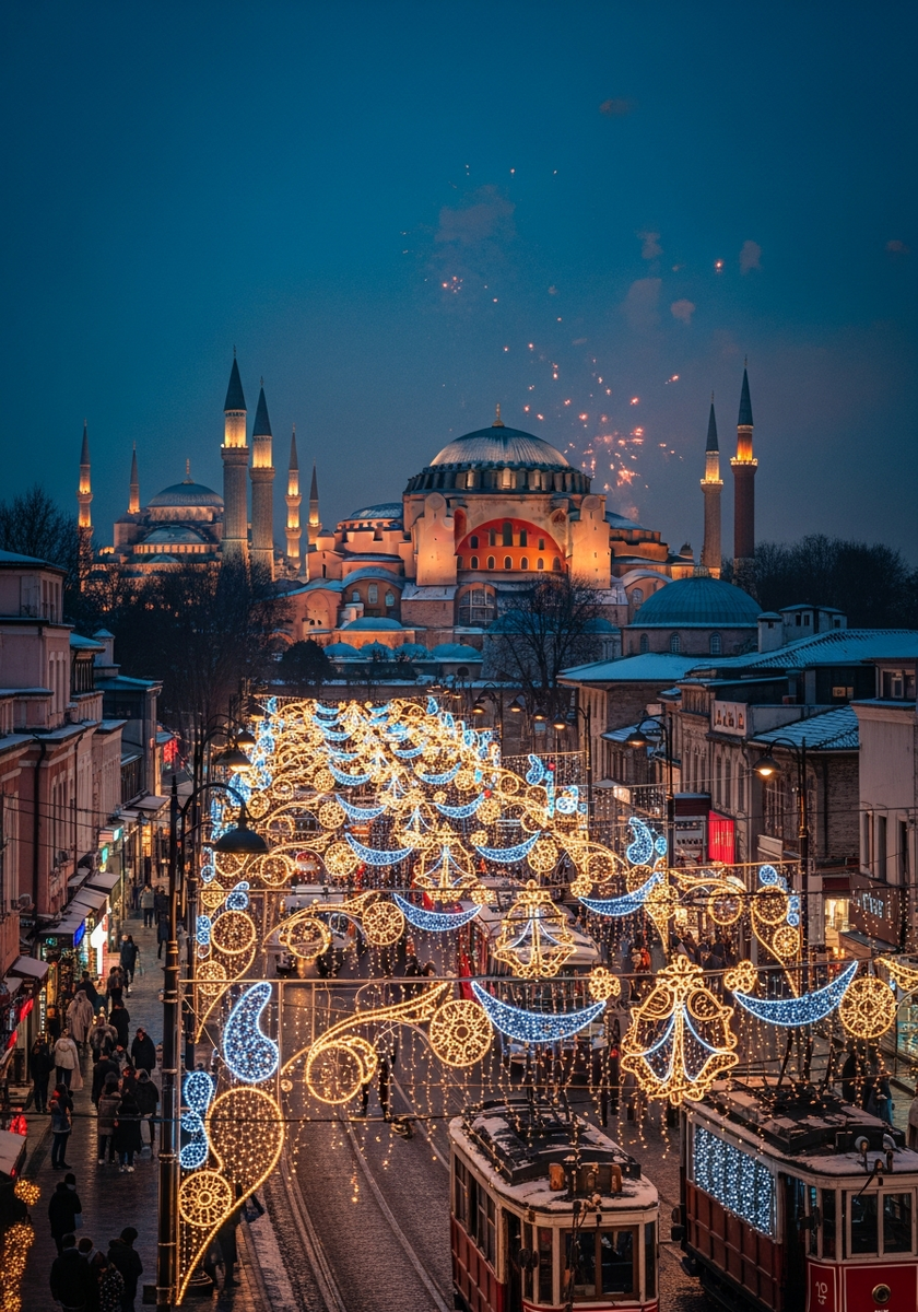 Площадь Таксим — сердце современного Стамбула и главное место новогодних празднований. В новогоднюю ночь здесь собираются тысячи людей, звучит музыка, а ровно в полночь небо озаряет грандиозный фейерверк.