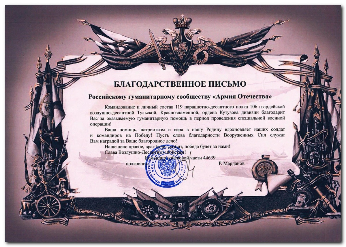В адрес участников нашего Российского гуманитарного сообщества "Армия Отечества" поступила благодарность от командира 119 гв