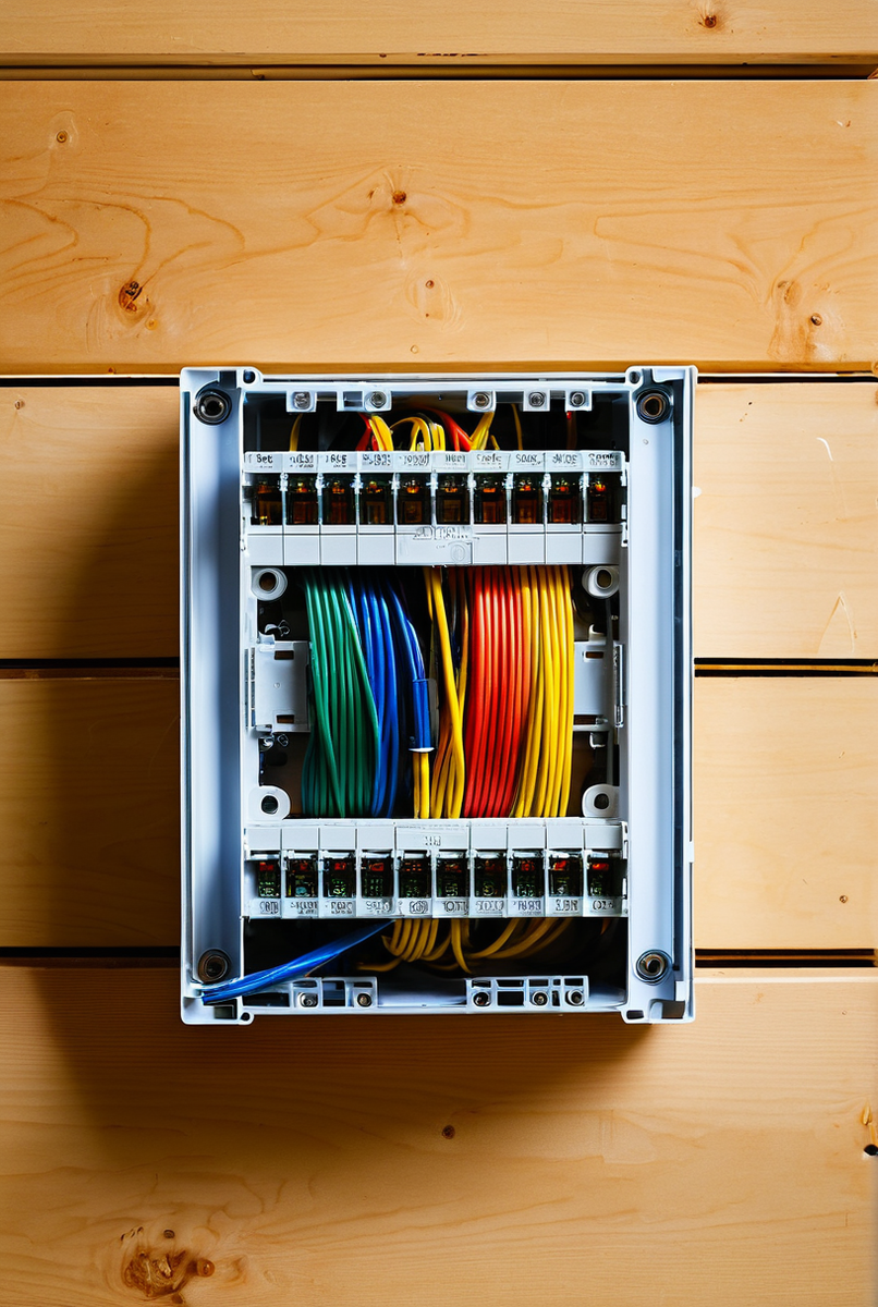 При установке в деревянном доме главное — огнестойкость. Рекомендуется пластиковая коробка из самозатухающего ПВХ или поликарбоната. Надежнее — металлическая коммутационная коробка, но ПУЭ требует для нее заземление корпуса. Правила монтажа также требуют монтировать ее на негорючее основание.