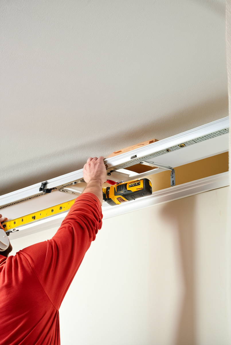 Правильная разметка — основа успешной установки. Первым делом определяем вынос от стены: гардина не должна задевать подоконник, радиатор. Оптимально — 15-20 см. С помощью рулетки и строительного уровня чертим на потолке ровную линию будущего карниза.