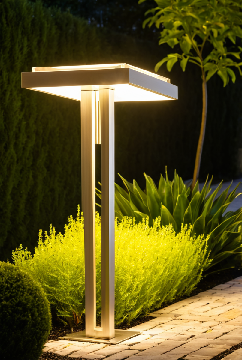 - Современный стиль: Характеризуется лаконичностью, прямыми линиями и геометрическими формами. Такие светильники универсальны и органично вписываются в большинство современных проектов; Они отлично справляются с задачей подсветки дорожек и функциональным зонированием пространства.