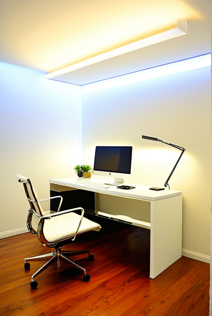 - Светильники для офиса: Для рабочей атмосферы подходит холодный свет или нейтральный белый. LED-панель или линейный светильник обеспечат равномерное освещение без бликов.