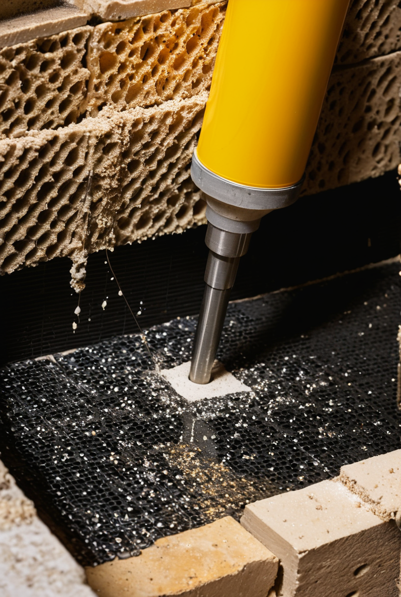 - Установка перфорированной гильзы и заполнение смолой: монтаж пластиковой втулки и работа с двухкомпонентным составом (жидкий дюбель) через картридж и статический миксер с помощью пистолета для герметика․