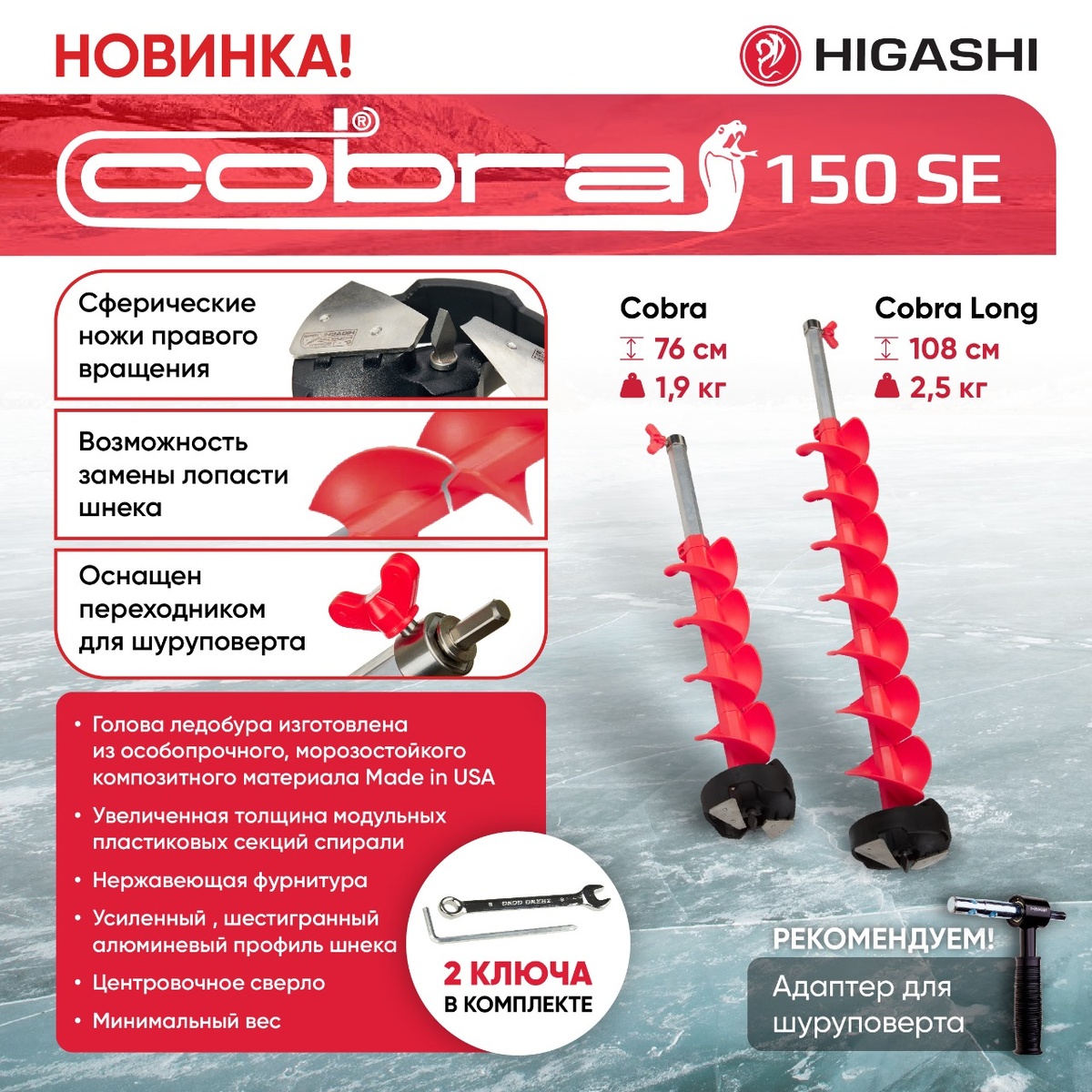 🆕Здравствуйте друзья представляем вашему вниманию шнеки Higashi COBRA 🔥Шнек HIGASHI COBRA🔥— это высокотехнологичное решение для любителей зимней рыбалки и активного отдыха на льду. 💥Оснащенный головой из особопрочного морозостойкого композитного материала Made in USA и сферическими ножами, этот шнек предлагает уникальную модульную, двухзаходную систему спирали, разработанную из морозостойкого полимерного материала увеличенной толщины, который обеспечивает исключительную прочность и долговечность. 💥Спираль HIGASHI COBRA является самой прочной среди ледобурных спиралей из композитных материалов, что гарантирует её устойчивость к ударам и абразивным нагрузкам. Благодаря инновационному дизайну, шнек эффективно удаляет ледовую крошку при сверлении, а также минимизирует обледенение во время работы, что значительно упрощает процесс бурения. 💥Важным аспектом конструкции является вал шнека, выполненный из упрочненного алюминиевого конструкционного сплава 6060. Его шестигранный профил