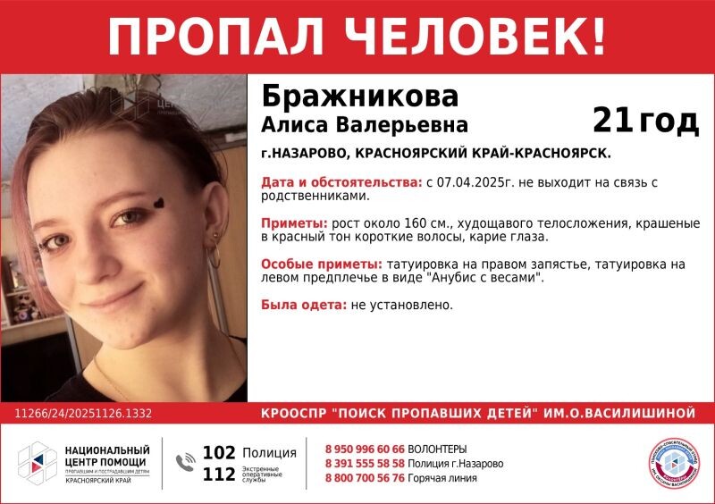 🔍🔎🔦 В городе Назарово почти 8 месяцев разыскивают 21-летнюю Алису Бражникову. С 7 апреля 2025 года она не выходит на связь с родственниками. ПРИМЕТЫ: рост около 160 см., худощавого телосложения, крашеные в красный тон короткие волосы, карие глаза. ОСОБЫЕ ПРИМЕТЫ: татуировка на правом запястье, татуировка на левом предплечье в виде «Анубис с весами». «Просим всех, кому известно местонахождение пропавшей, сообщить по телефонам: - 8 (39155) 5-58-58 полиция г. Назарово; - «112» единый телефон вызова экстренных оперативных служб; - 8-950-99-66-066 волонтёры (круглосуточно)», — обращаются волонтеры к населению. Фото: Поиск пропавших детей им. Оксаны Василишиной 🇷🇺 Запад 24 в MAX