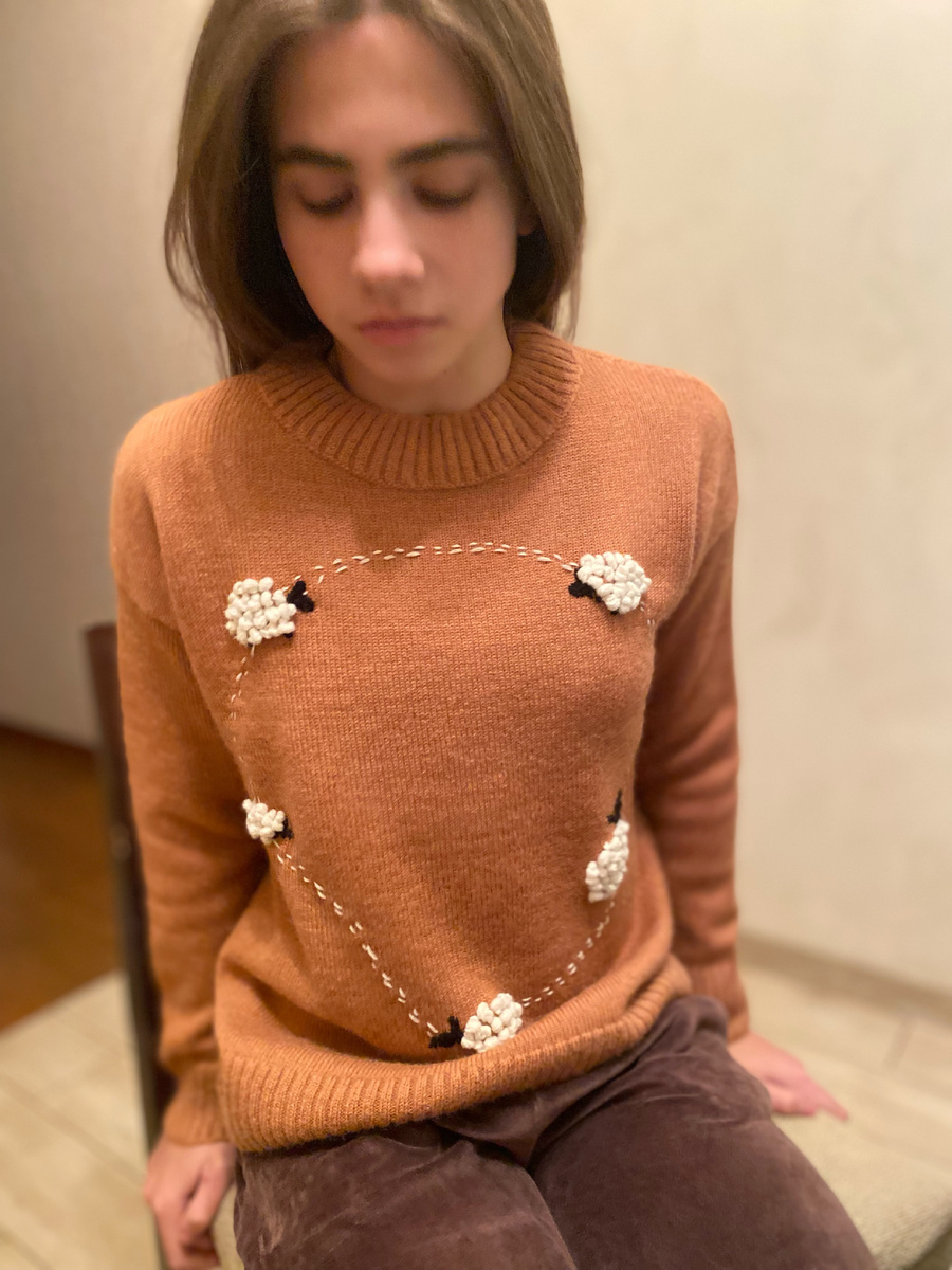 По просьбе детки связала джемпер и украсила вышивкой. Получилось пять овец, соединенных дорожкой. Множество овец гуляет в Pinterest, там же посмотрела как лучше вышить. Джемпер вязала на машине 5 класса по стандартной выкройке. Вязание отдельными деталями снизу вверх. Кеттлевка воротника, промышленная резинка. Использовала пряжу: ▪️две нитки мериноса 1500м/100 гр, ▪️одна нить мохера 1000м/100 гр, ▪️вес 380 грамм. Для достижения объемного эффекта, тело овечки вышивала толстой пряжей «французскими узелками». Голова и ноги - черной гладкой пряжей. С овечками джемпер получился с настроением, домашним, радостным и тёплым. #ждемперсовечками #машинноевязание #свяжуврадость
